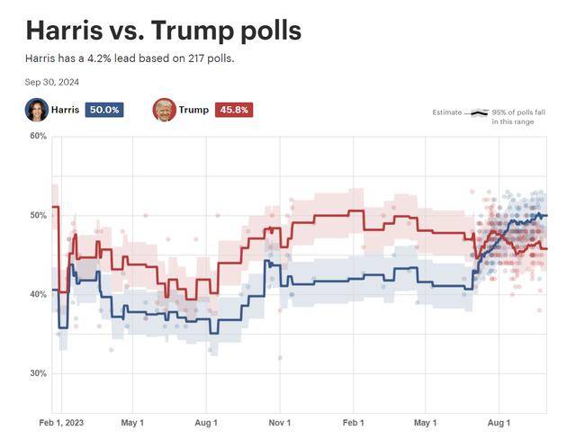 距离11月5日的总统大选还有一个多月的时间, 两位候选人仍旧势均力敌。在《国会山报》(the Hill)/美国选举预测机构决策台总部(DECISION DESK HQ,以下简称DDHQ)跟踪的217份民意调查中,哈里斯仅领先特朗普4.2%。