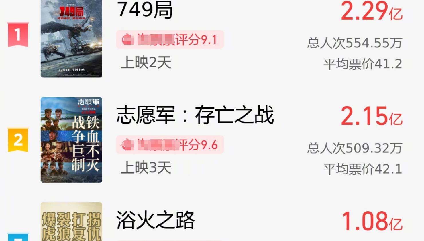 2024年国庆档,三部备受关注的电影《749局》、《志愿军2》和《浴火之路》在豆瓣的评分可谓是参差不齐。《749局》以5.0分的低分领跑,而《志愿军2》和《浴火之路》分别以7.5分和6.5分位列其后。然而,截至10月2日13时18分的数据显示,三部电影的国庆档票房已经突破7亿,成为档期的票房冠军。