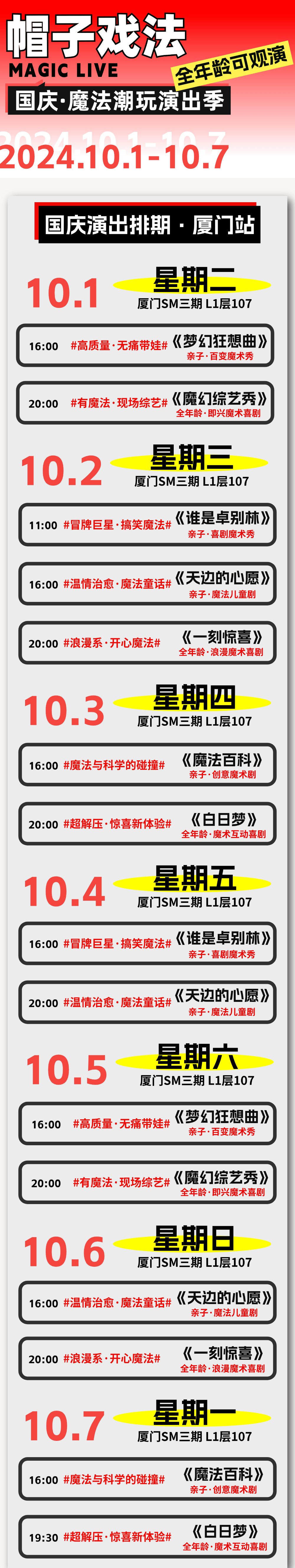 【参与方式】关注“厦门文旅”微信公众号,评论区留言分享“你最想去看帽子戏法·MagicLive魔法潮玩演出季的理由 你想观看的场次”,我们将从不少于10个赞的粉丝留言中, 亲子·魔法儿童剧《天边的心愿》场次精选抽取6位粉丝,全年龄·魔术互动喜剧《白日梦》场次精选抽取5位粉丝,各送出所选场次演出票2张。
