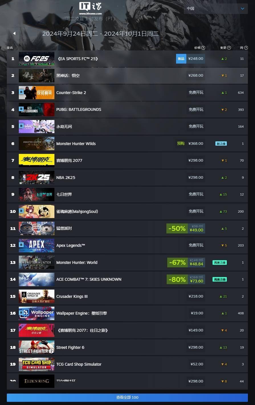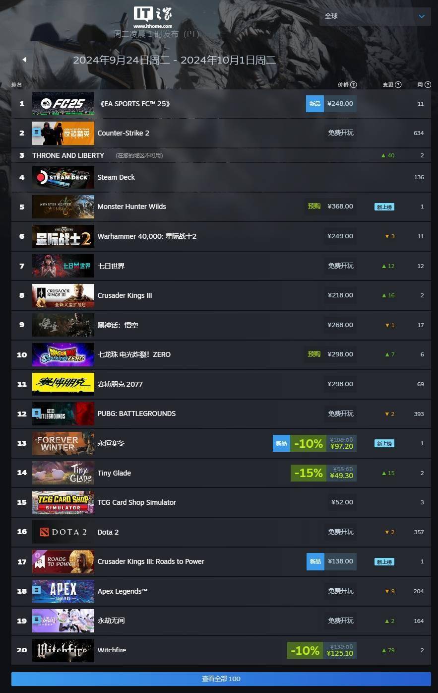 IT之家附 Steam 新一周销量榜(剔除免费游戏内容和 Steam Deck):