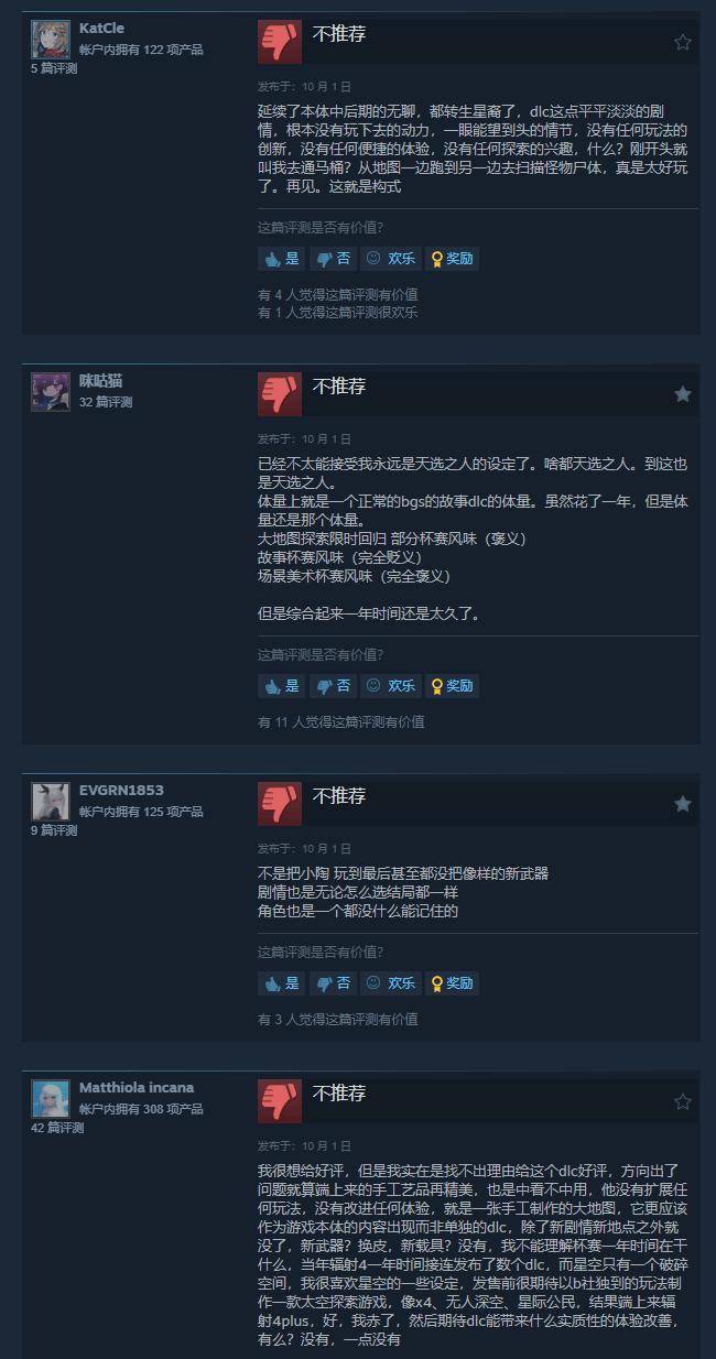“不推荐”玩家则认为该 DLC“延续了本体的制作水准,也就是毫无起伏情绪调动基本没有的剧情”,还有玩家写道:“他没有扩展任何玩法,没有改进任何体验,就是一张手工制作的大地图,它更应该作为游戏本体的内容出现而非单独的 DLC”。