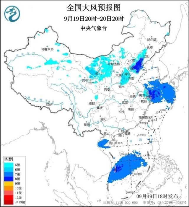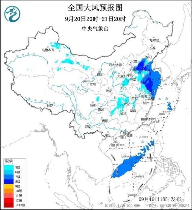预计,9月19日20时至20日20时,内蒙古中西部、甘肃中东部和河西、宁夏中部、陕西北部、辽宁西部、河北南部和东北部、天津东部、山东北部和西部、河南北部、上海大部、江苏东南部、浙江东北部等地部分地区有5~6级、阵风7~8级的大风,其中,辽宁南部、浙江东北部沿海、上海沿海、江苏东南部沿海等地部分地区有7~8级、阵风9级的大风;渤海、渤海海峡将有7~8级、阵风9~10级的东北风,杭州湾、长江口、东海北部海域、黄海南部海域将有7~8级、阵风9~11级的大风,南海南部海域、北部湾将有7~8级、阵风9级的大风。