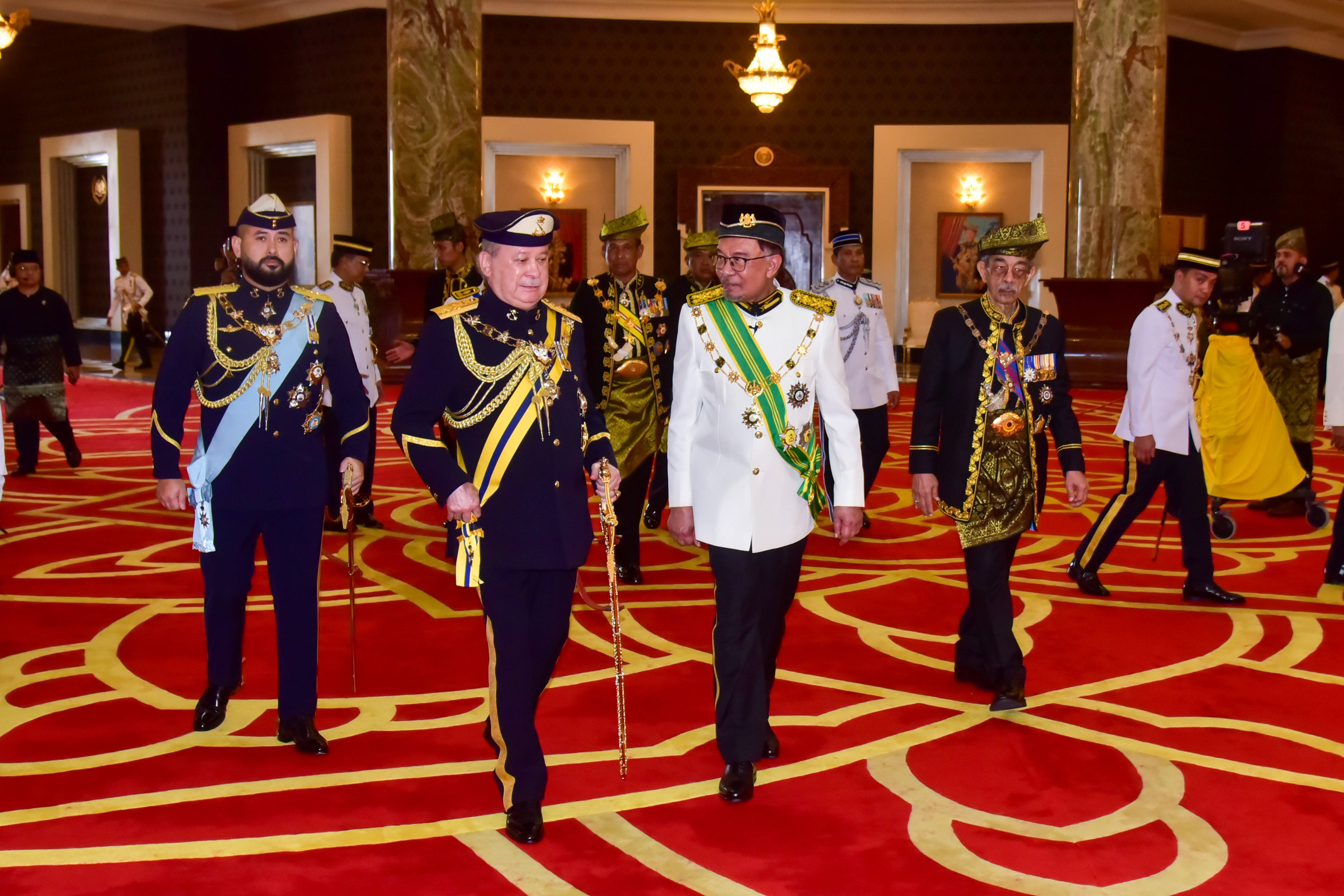 1月31日,马来西亚新任最高元首易卜拉欣(前左)抵达位于吉隆坡的国家皇宫参加宣誓就职仪式。(新华社发)