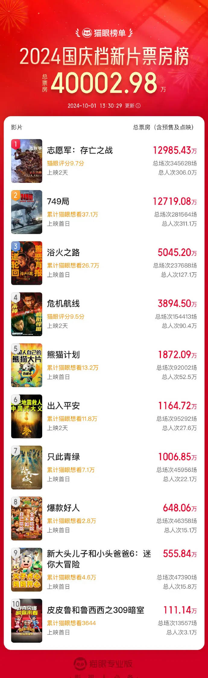 搜狐娱乐讯 据猫眼专业版数据,截至10月1日13时30分,2024年国庆档新片总票房(含预售及点映)破4亿!《志愿军:存亡之战》《749局》《浴火之路》分列国庆档票房榜前三位。