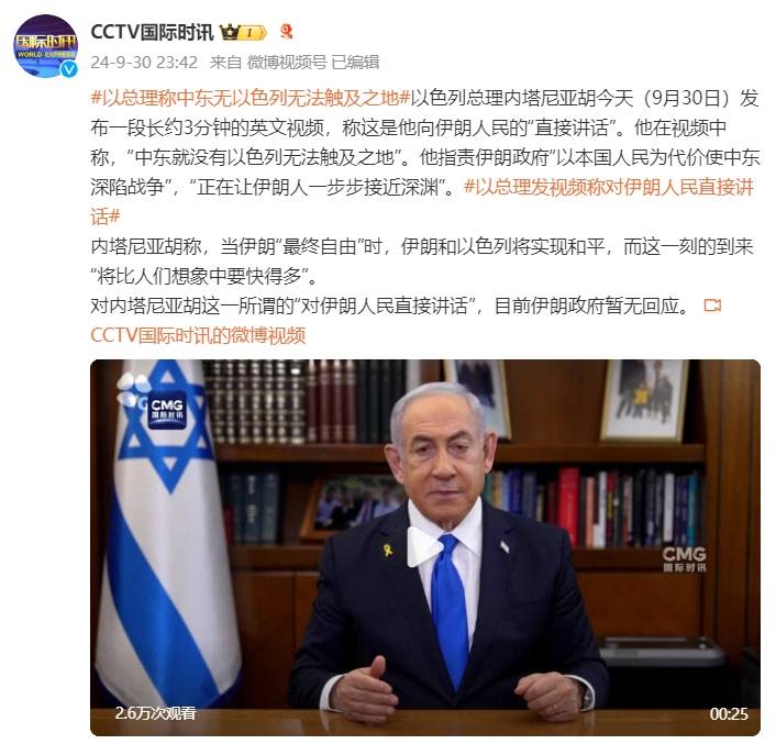 以色列总理内塔尼亚胡9月30日发布一段长约3分钟的英文视频,称这是他向伊朗人民的“直接讲话”。他在视频中称,“中东就没有以色列无法触及之地”。他指责伊朗政府“以本国人民为代价使中东深陷战争”,“正在让伊朗人一步步接近深渊”。