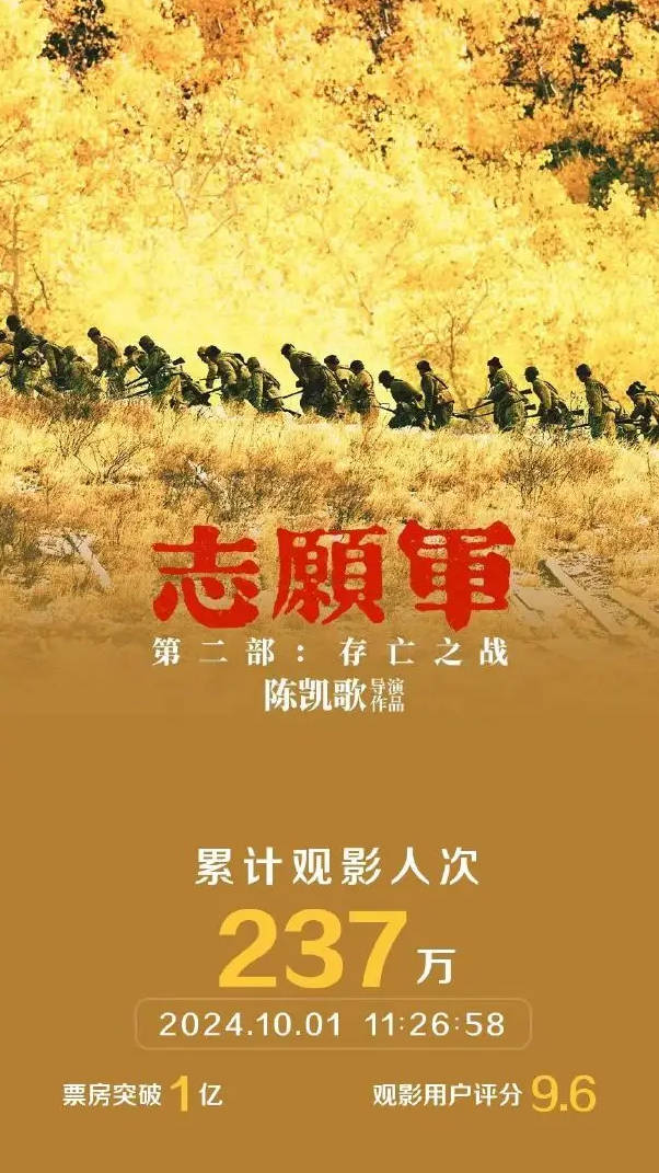 搜狐娱乐讯 据灯塔专业版实时数据,截至10月1日11时26分,影片《志愿军:存亡之战》票房突破1亿。