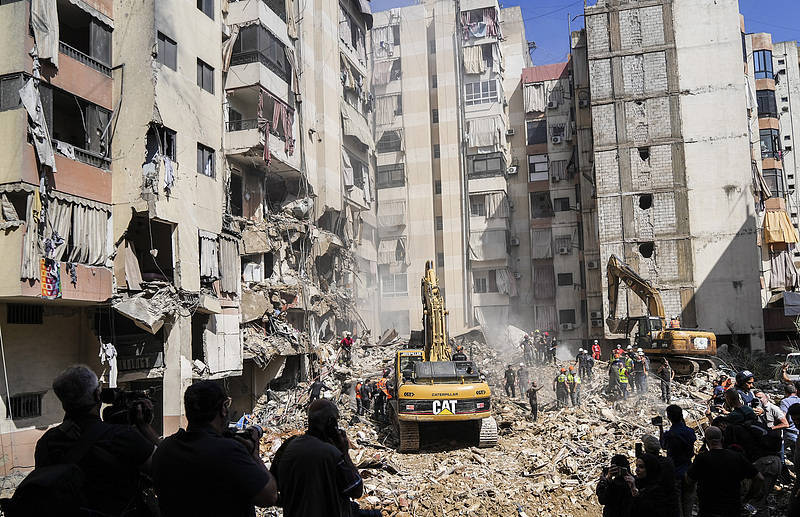 △以色列20日空袭贝鲁特南部郊区,21日救援人员在废墟中展开搜救工作。