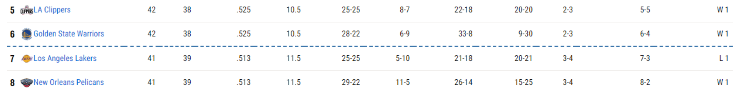 在昨日快船赢下洛杉矶德比后,他们凭借胜负关系力压勇士上升到西部第五,湖人则保持在西部第七的位置没有变动。
