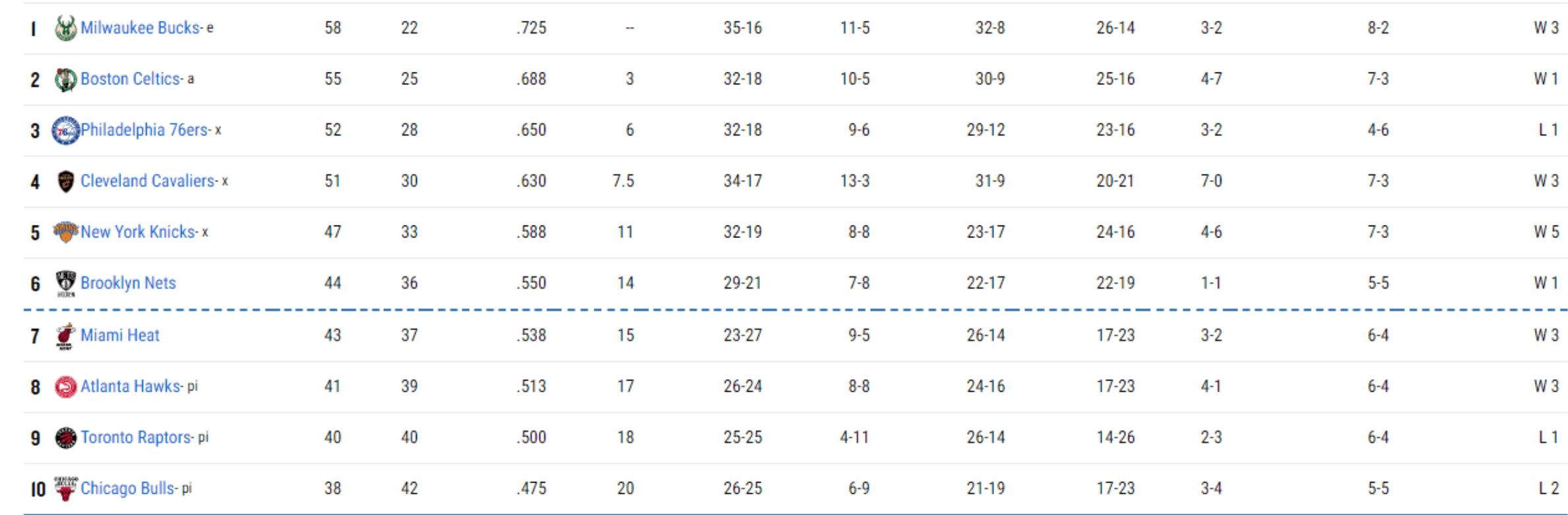 与西部不同,东部的季后赛形势已经逐渐明朗。雄鹿绿军76人骑士锁定1-4名,唯一的变数就在热火和篮网的6-7名。
