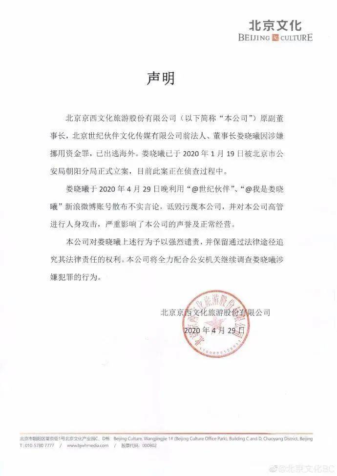 资本运作为北京文化带来了无两风光,也埋下了日后高管反目的种子。2020年4月,北京文化原副董事长娄晓曦在公司年报发表次日公开实名举报北京文化涉嫌财务造假。这直接牵出了北京文化的高层内斗序幕,后又在郑爽阴阳合同等事件冲击下雪上加霜。