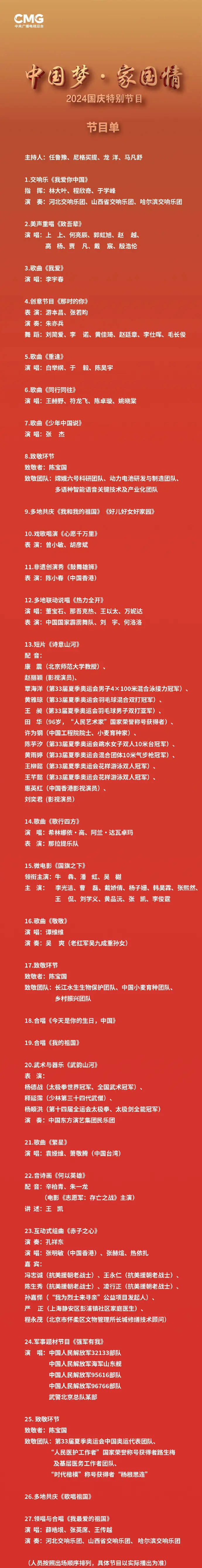 搜狐娱乐讯 9月30日,中央广播电视总台《中国梦·家国情——2024国庆特别节目》公布节目单,包括李宇春、张杰、谭维维等歌手将会在晚会上表演歌曲节目。朱一龙、王凯等演员将带来音诗画的创意节目。