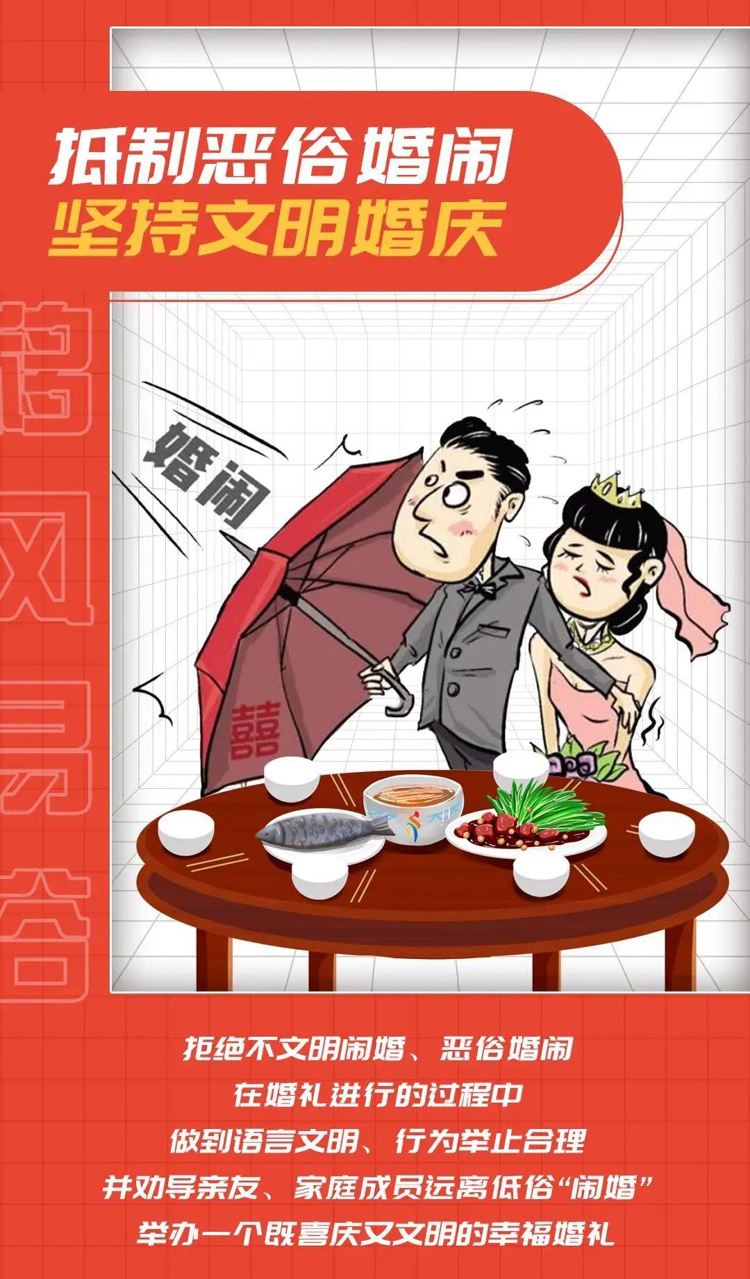 二、推行婚俗改革,倡导婚事新办。倡导简约适度婚俗礼仪,提倡优秀传统婚礼,推广新型婚礼模式。推行集体婚礼、纪念婚礼、慈善婚礼、绿色婚礼、骑行婚礼等特色突出、文明节俭的现代婚礼,助推传统文明和现代文明融合发展,培育文明向上的婚俗文化,营造风清气正的社会空间。