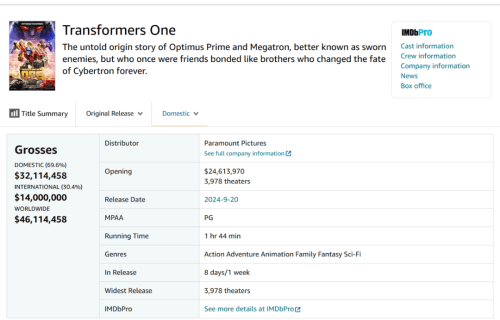 据IMDbPro统计,《变形金刚:起源》从20号开始铺开至北美3978家影院,首日曾以956万美元登顶榜首,带动大盘环比上涨逾三倍。但接下来的走势偏弱,首周末报收于2461万美元,单馆收益为6187美元,不敌《怪奇大法师》屈居亚军。