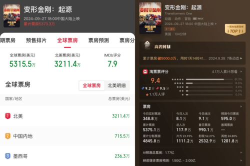受到《变形金刚:起源》等新片的支撑,北美周末大盘下滑12.8%至8173万美元,仍比去年同期高出五成以上,延续暑期档以来的复苏势头。截至24日,北美月度总票房迫近4.8亿美元,已赶超去年整个9月的总收成(4.75亿美元),成为今年第三个同比上涨的月份。在这个过程中,北美全年累计收成于9月中突破60亿大关,去年则在8月份便撞线。