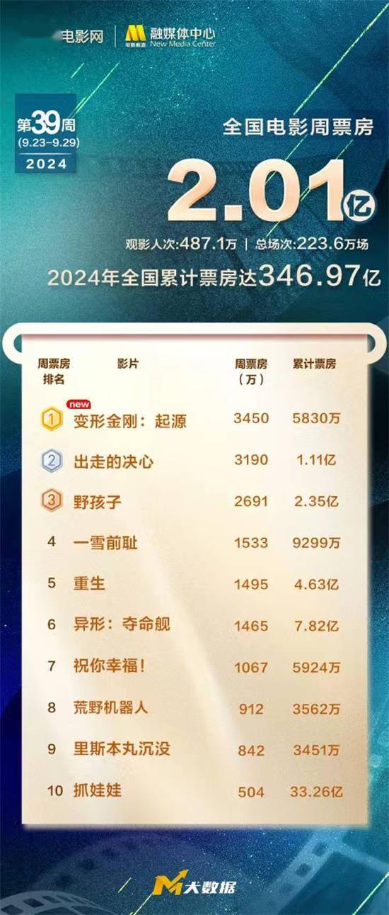 1905电影网讯2024年第39周(9.23-9.29)全国电影周票房2.01亿元,观影人次超487.1万,总场次超223.6万场,2024全年电影票房累计346.97亿元。