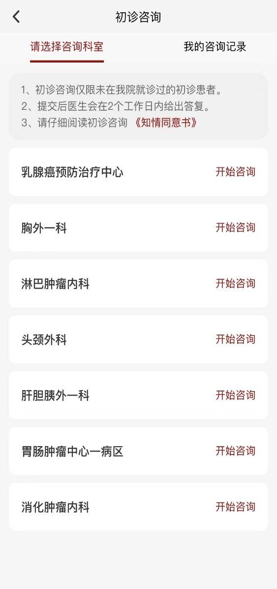 1.对于需要检查是否有肿瘤,以及在外院检查提示有肿瘤需要确诊的初诊者,乳腺癌预防治疗中心提供线上咨询及预约挂号服务,进而合理安排就诊时间,减少往返医院的奔波。您可以下载“北肿云病历” APP,进入“初诊咨询”—“乳腺中心”模块,填写相关信息及上传当地医院检查报告,专业医师审核后,将于2个工作日内给您给予初步建议,并为有必要的就诊者预约初诊门诊现场号源。具体步骤为: