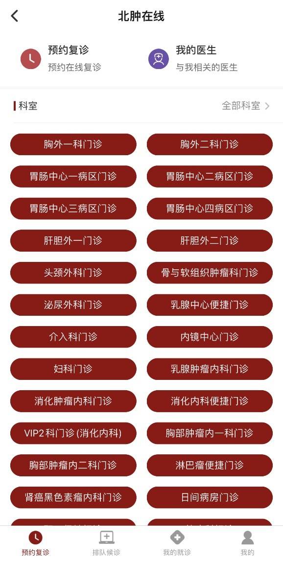 3.评价复查结果可通过“北肿云病历”APP内的“预约挂号”模块预约“术后复查门诊”。对于尚未就诊过的患者,无法预约“术后复查门诊”。
