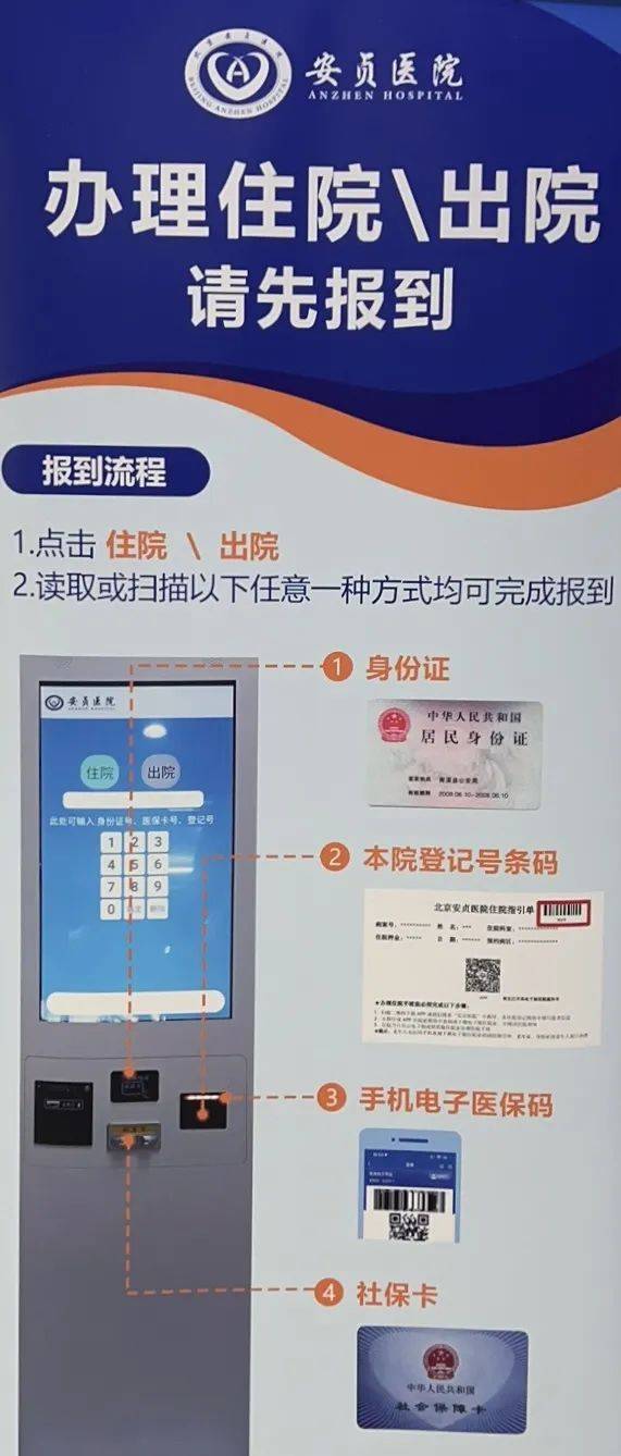 首先在报到机上点击住院/出院,然后读取或扫描以下任意一种方式均可完成报到:身份证、北京安贞医院登记号条码、手机电子医保码、社保卡。