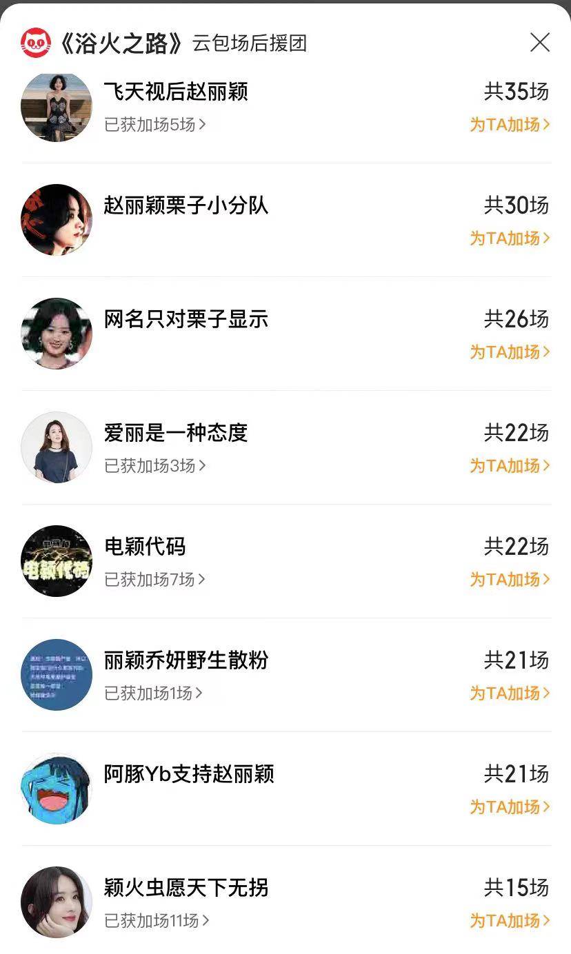 云包场前七名,都是赵丽颖的粉丝,一共包场1243场,最多的336场。