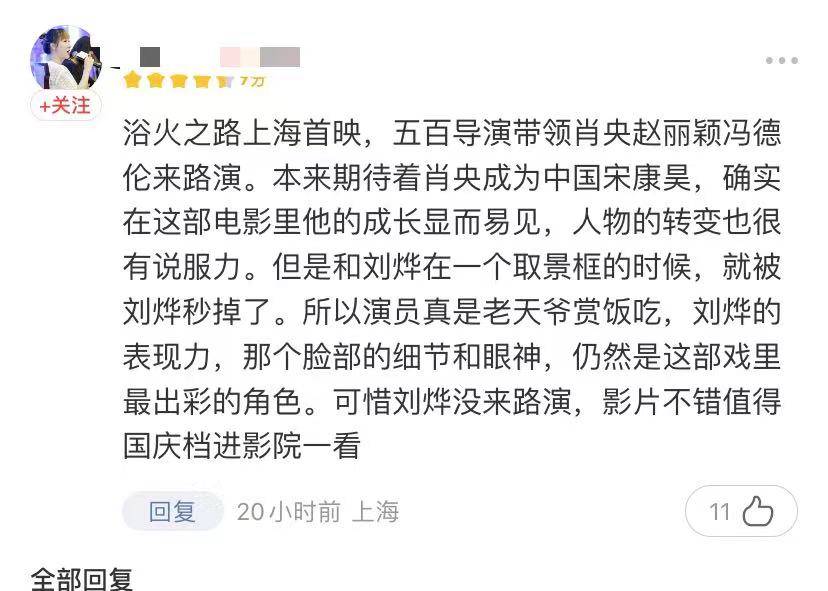 来自上海的猫眼网友表示肖央和刘烨在电影中的表现,还是刘烨略胜一筹,刘烨的表现力,脸部的细节和眼神,仍然是这部戏里最出彩的角色,可惜刘烨没有来路演,影片不错值得一看。
