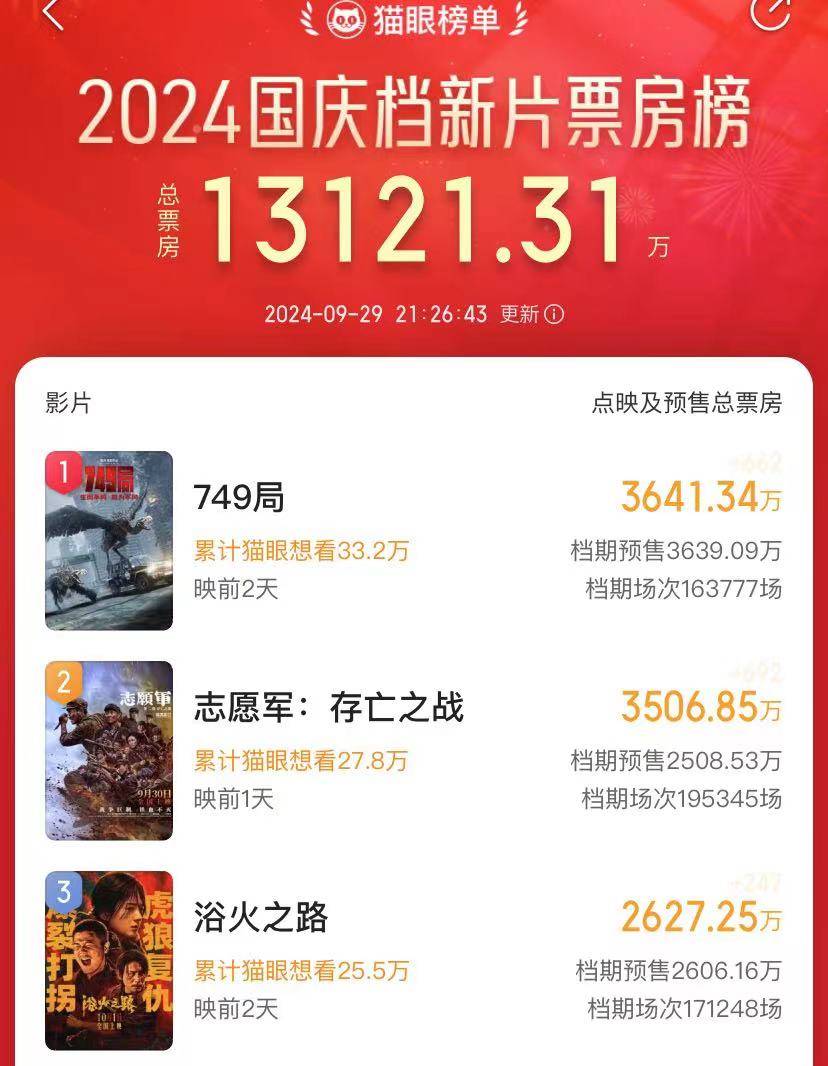 明天《志愿军:存亡之战》将上映,随着《749局》《浴火之路》会在10月1日上映。