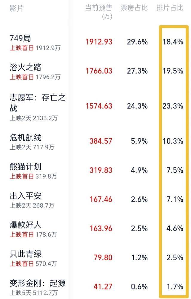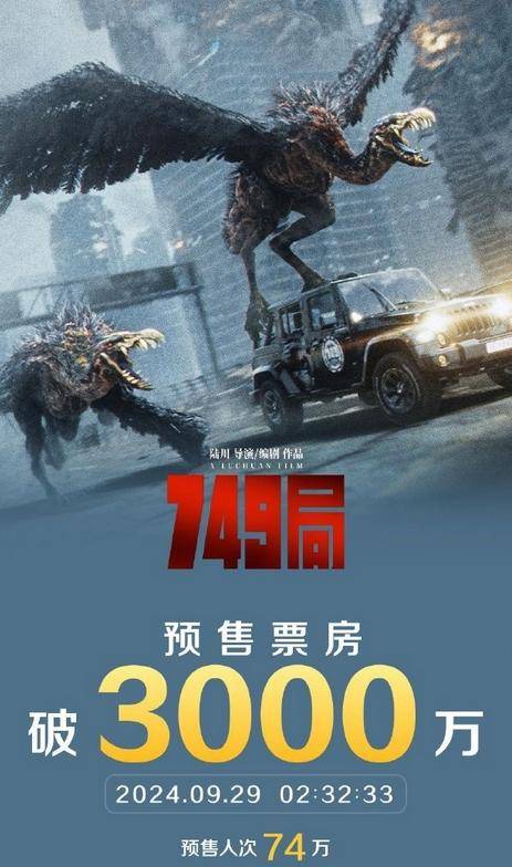 截至9月29日2时32分,影片《749局》预售总票房突破3000万。为什么《749局》能在国庆档遥遥领先?看目前的排片:《志愿军2》 23.3%,《浴火之路》 19.5%,《749局》18.4%,不过预售却是第一,可见其魅力。