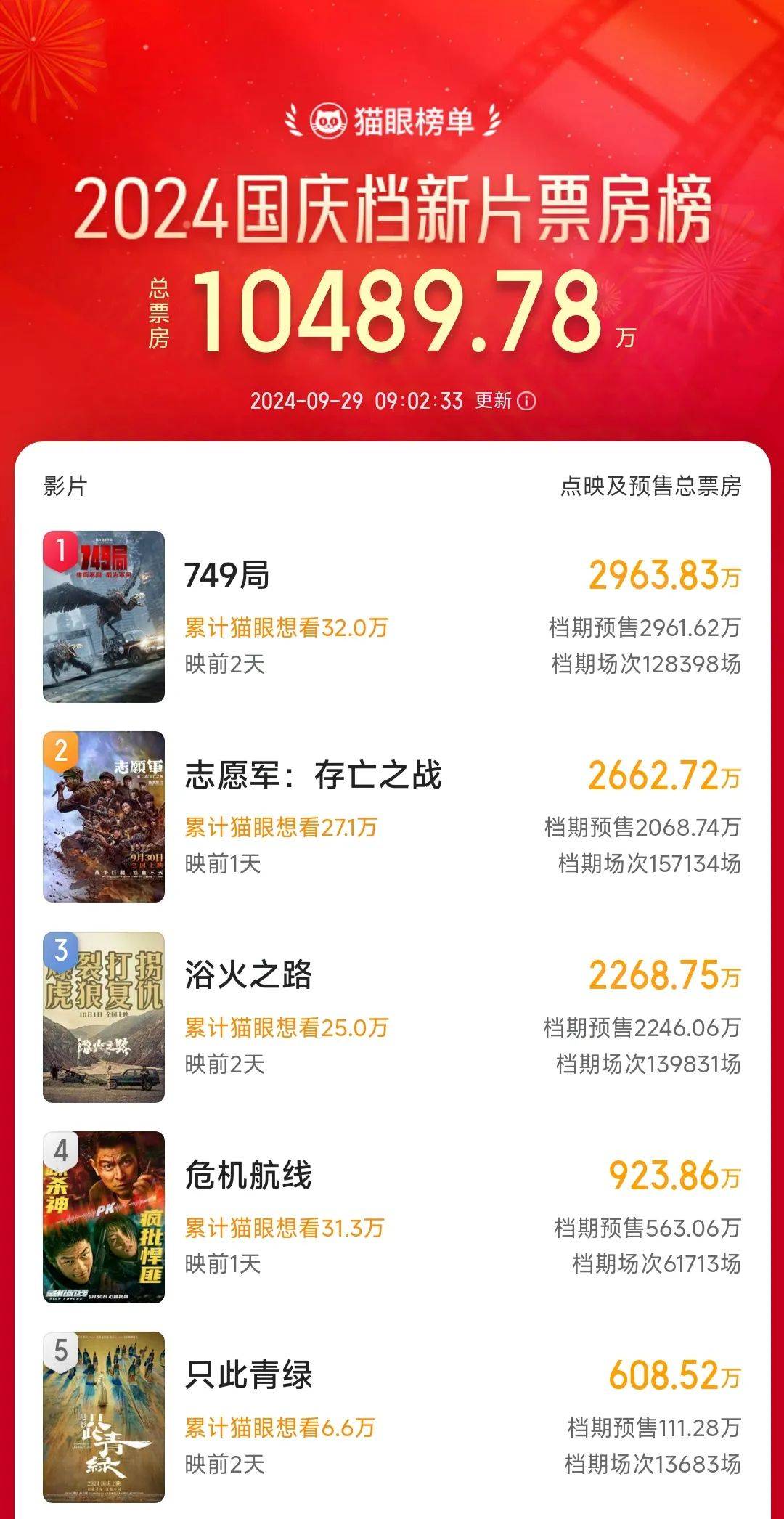 总结下来,今年国庆档10部新片里,8部真人电影之间的差距并不大。目前预售落后的《危机航线》《只此青绿》《熊猫计划》《出入平安》《爆款好人》等片,也有非常鲜明的卖点,有值得一冲的可看性。你,还打算“谋定后动”吗?