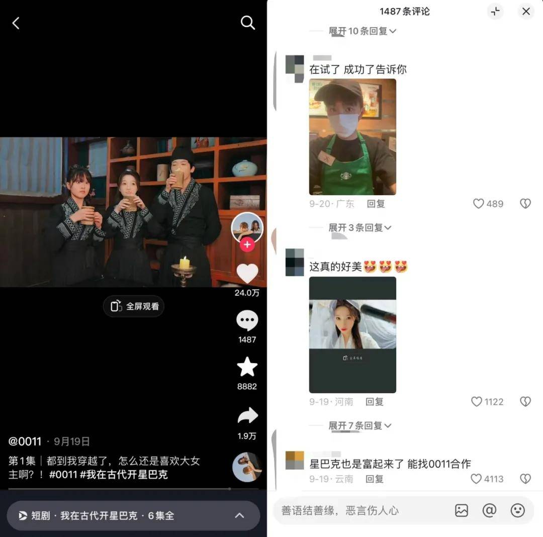 9月19日,星巴克上线了品牌首部短剧《我在古代开星巴克》,该剧以穿越为大背景,讲述了星巴克伙伴11带着咖啡豆穿越古代后,在当地组团开“星巴客栈”的故事。同时,穿越后的11还邂逅了一位意中人,并最终在现实世界再续前缘。