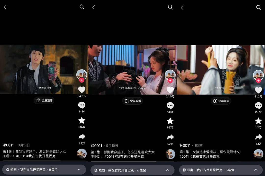 而且《我在古代开星巴克》是与在抖音头部剧情CP达人@0011合作,剧集也是首发于达人的抖音账号。这种模式的优势在于自带流量和曝光,@0011目前在抖音上拥有549.8万粉丝,品牌可以借达人的粉丝群体快速实现大曝光。另外,这些粉丝和达人之间有更高的粘性和信任,也更容易接受达人推荐的品牌。