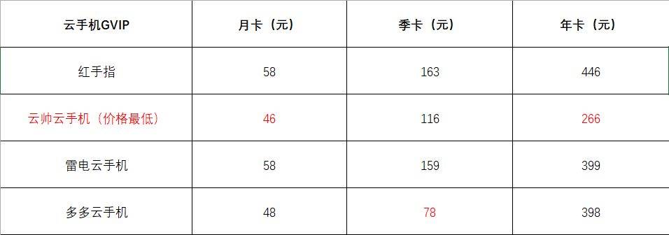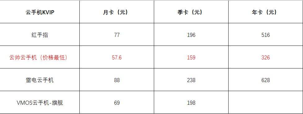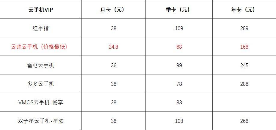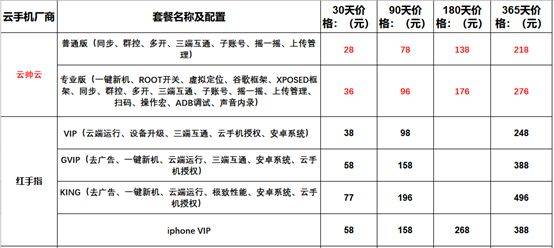 下面是云帅云手机的价格对比的图表,看看对比红手指、雷电云手机的价格差别就可以直观看到优势在哪。
