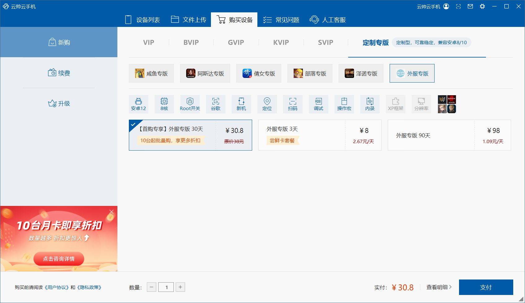 云帅云手机拥有多种套餐的云手机配置,还有各种传奇和热门挂机搬砖手游的专版,包括可以使用海外游戏进行搬砖的专版,这些都是可以直接为用户进行使用并且帮助他们的。