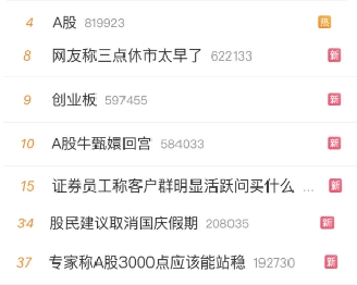 不少股民在社交平台拜求国庆小长假可否开市交易,“国庆给A股加个班”“3点休市太早了”“股民着急找回账户密码”“A股牛甄嬛回宫”等多个话题连续冲上热搜。
