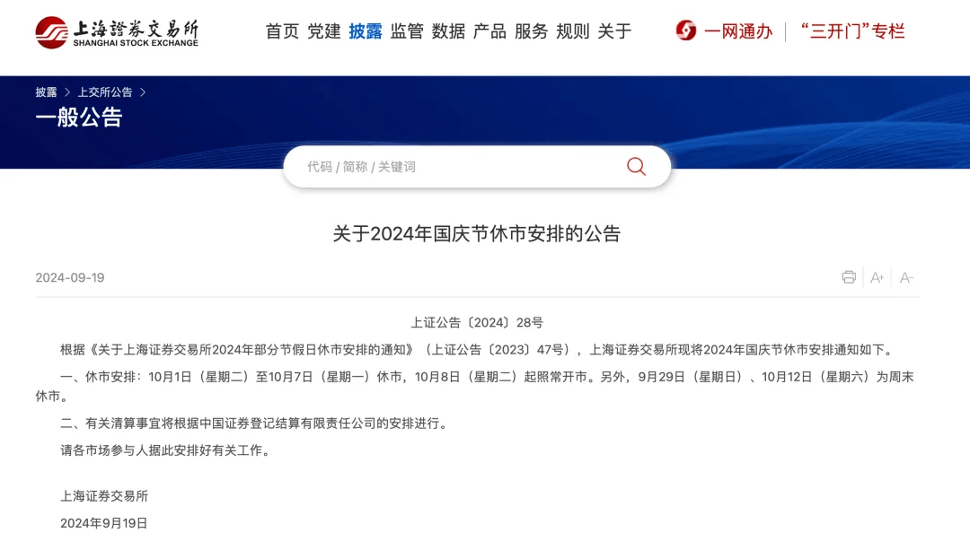 沪深北交易所发布2024年国庆节休市安排,10月1日(星期二)至10月7日(星期一)休市,10月8日(星期二)起照常开市。另外,9月29日(星期日)、10月12日(星期六)为周末休市。