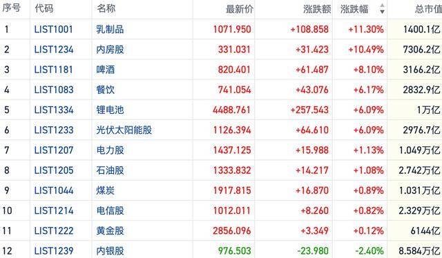 一方面,今日乳业、光伏、锂电等前期处于低位的行业开始补涨。此外,银行、电信等红利板块继续跑输大市,资金高低切换倾向明显。