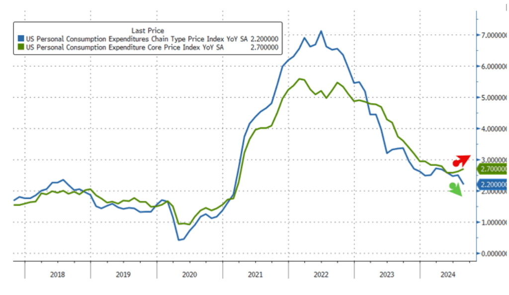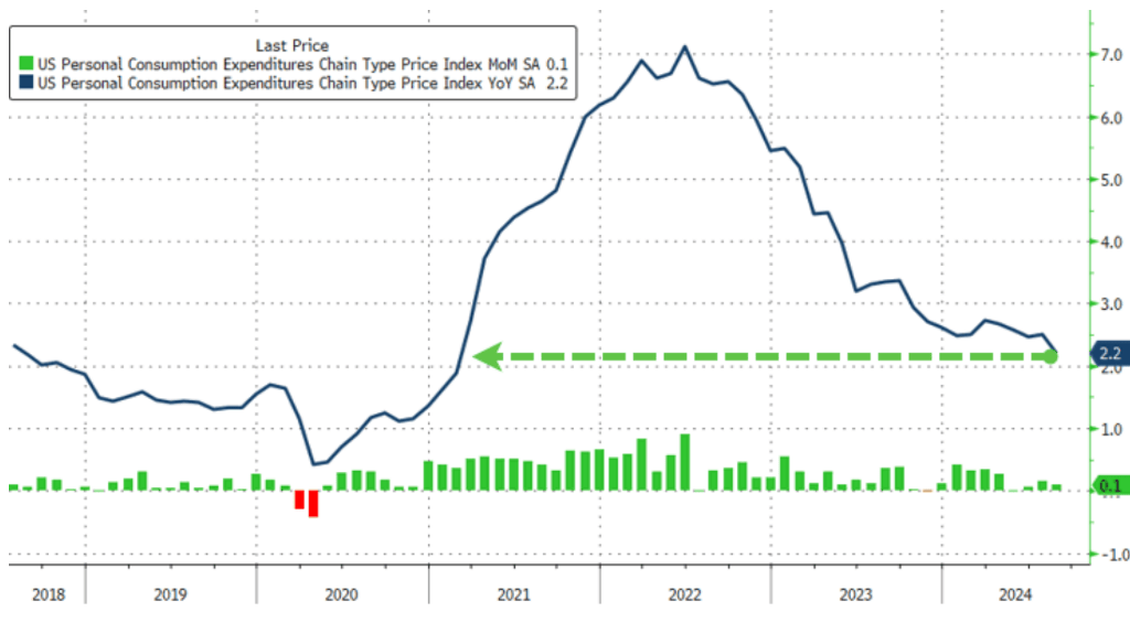 整体PCE同比下降至2.2%,为自2021年3月以来的最低水平,预期值2.3%,较上月值2.5%降温。