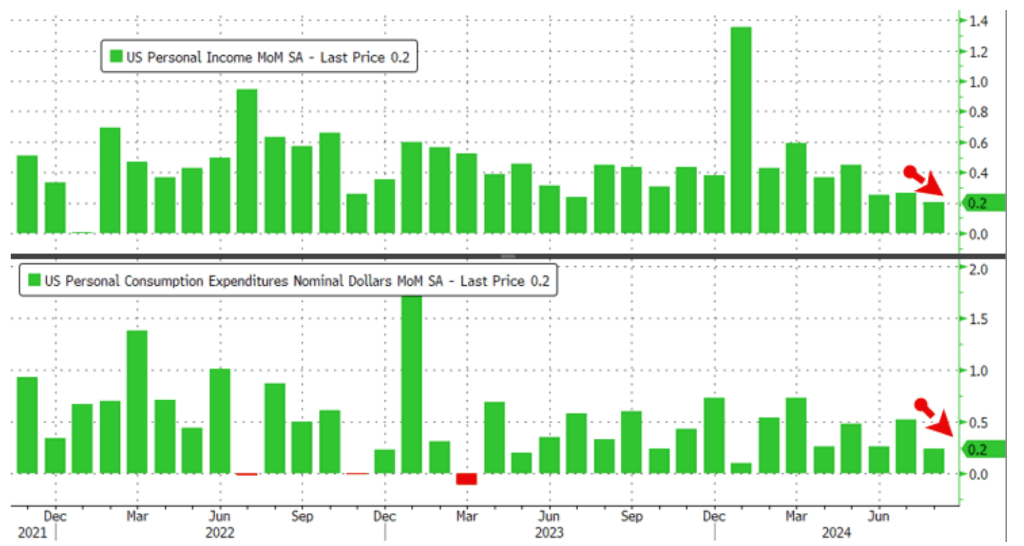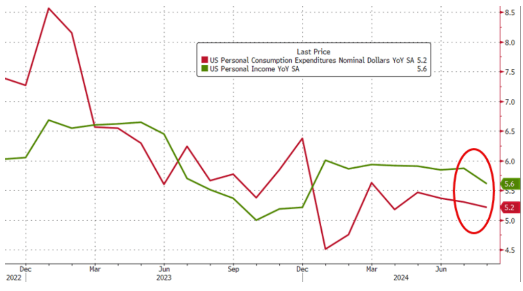 “8 月份个人收入、支出和通胀数据意外下滑,证实了美联储本月早些时候决定下调政策利率 50 个基点的决定。
