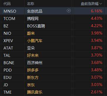 中概股继续走强,热门中概股中,名创优品涨逾6%,携程网、BOSS直聘涨超4%,蔚来、小鹏汽车、好未来涨超3%;成交量靠前的阿里巴巴涨逾1%,拼多多、京东涨超3%。