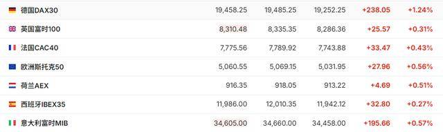 正在交易的欧洲股市也多数走高,德国DAX30指数现涨1.24%,英国富时100指数涨0.41%,法国CAC40指数涨1.43%。