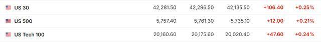 截至发稿,道琼斯指数期货涨0.25%,标普500指数期货涨0.21%,纳斯达克100指数期货涨0.24%。