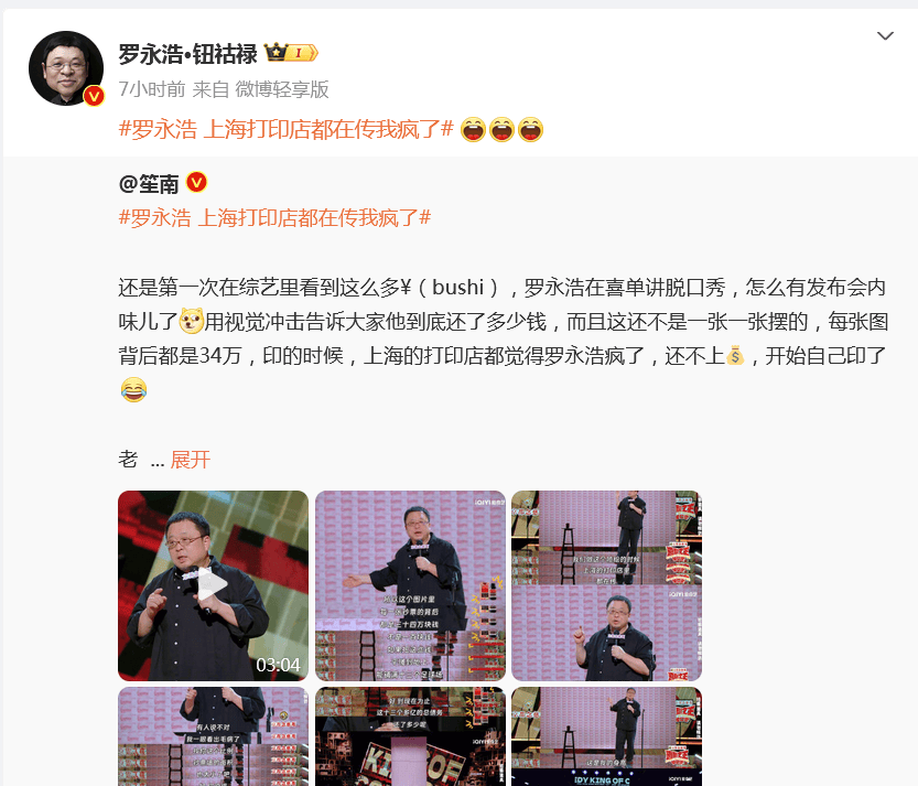 9月27日,在近期播出的节目中,罗永浩作为嘉宾上台演绎了一段脱口秀。他在分享中,告知观众已还完8.24亿元债务,还把8.24亿元人民币图片拼接在一起,直观展示给大家。
