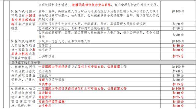 行政监管方面,新增保荐机构因保荐项目被证监会及其派出机构采取撤销或暂停保荐业务资格行政监管措施的,扣100分。保荐机构相关人员因保荐项目被证监会及其派出机构采取行政监管措施的,相关人员被采取监管谈话的,扣40分;相关人员被责令改正的,扣30分;相关人员被出具警示函的,扣25分。