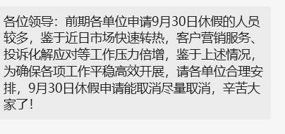 记者最新获悉,有券商下发通知,鼓励员工9月30日休假申请能取消尽量取消。具体原因中提到,前期各单位申请9月30日休假的人员较多,鉴于近日市场快速转热,客户营销服务、投诉化解应对等工作压力倍增,鉴于上述情况,为确保各项工作平稳高效开展,请各单位合理安排,9月30日休假申请能取消尽量取消。