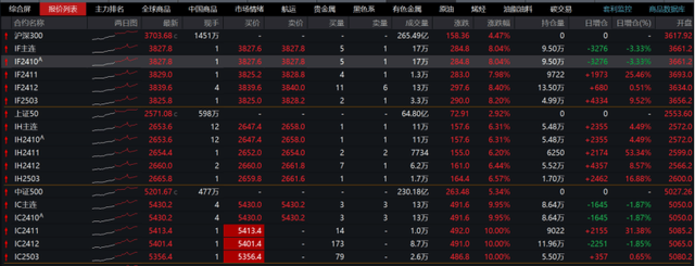 截至今日收盘,沪深300股指期货主力合约IF2410收涨8.04%;上证50股指期货主力合约IH2410收涨6.31%;中证500股指期货主力合约IC2410涨9.95%,中证1000股指期货主力合约IM2410涨9.99%。