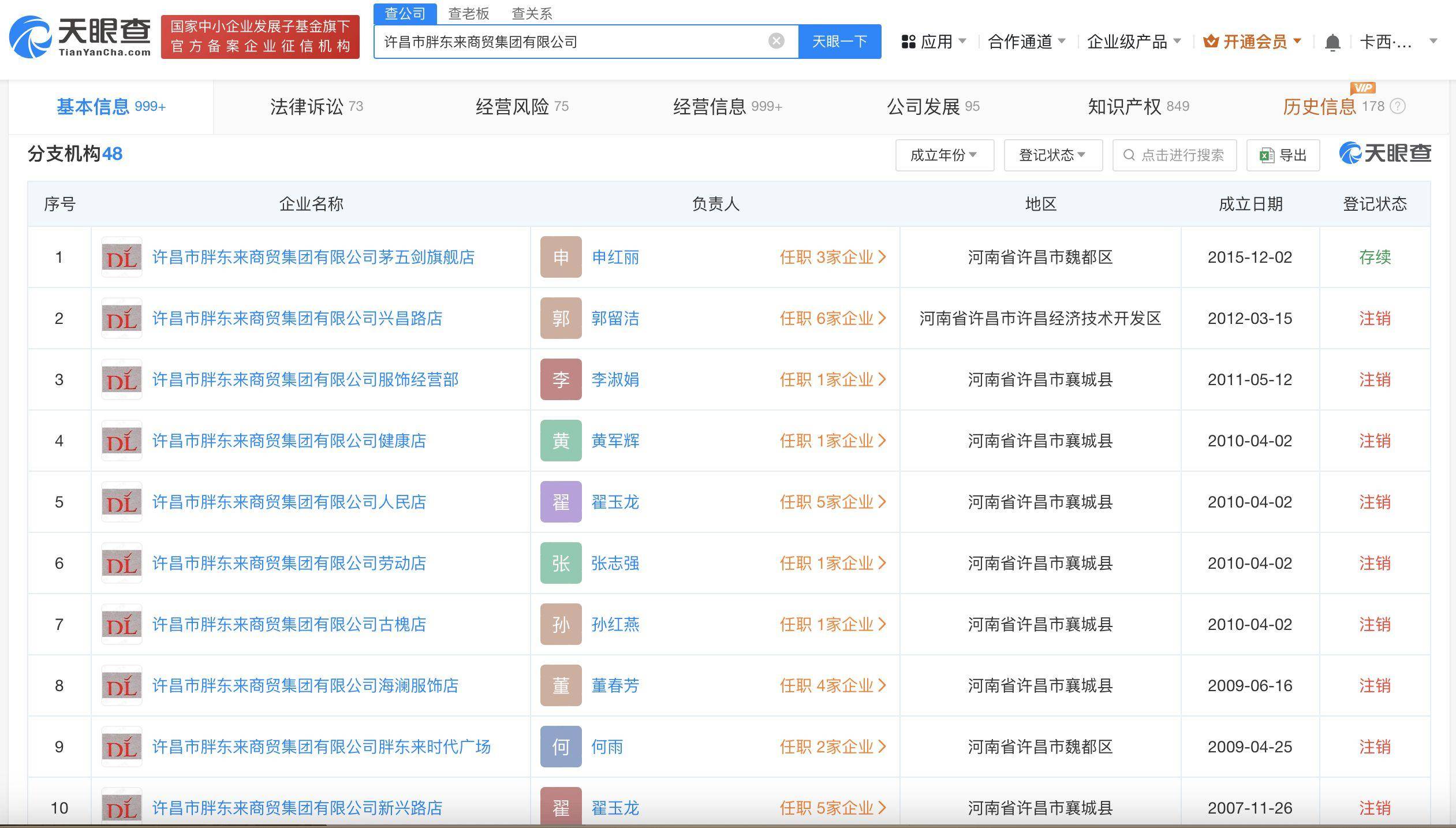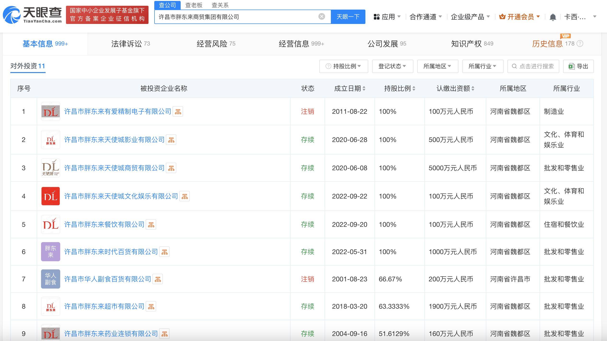 对外投资信息显示,该公司持股的10余家公司中,存续状态的有8家,包括许昌市胖东来天使城影业有限公司、许昌市胖东来天使城商贸有限公司等,涉及商贸、影视、餐饮、珠宝等领域。此外,该公司还在许昌拥有48家分支机构,但多数已注销。不过,其旗下的许昌市胖东来药业连锁有限公司、许昌市胖东来超市有限公司各有多家分支机构,大多数为存续状态。