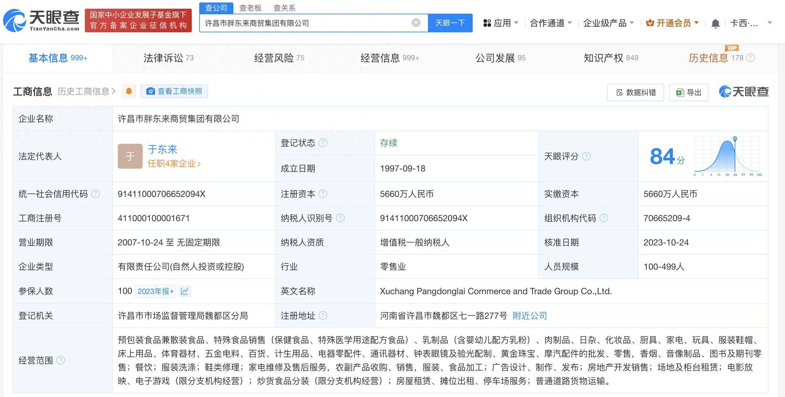 天眼查App显示,胖东来关联企业许昌市胖东来商贸集团有限公司成立于1997年9月,法定代表人、董事长兼总经理为于东来,注册资本5660万人民币,经营范围包括预包装食品兼散装食品、特殊食品销售、餐饮等,于东来持有公司约69.96%股份,为第一大股东及实控人。