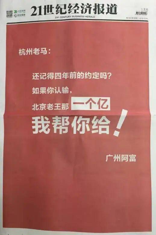 2016年左右,一个名为“广州阿富”的人,先后两次包下知名报纸的整个版面头条,只为和彼时的商业教父马云叫板——