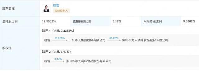 直至2014年海天味业上市时,程雪已经持有海天味业2511万股,占总股本的3.53%,并通过海天集团间接持股6.56%,合计持股比例高达10.09%。成为仅次于前董事长庞康的第二大股东,与前董事长庞康同为海天味业的共同控制人。目前天眼查数据显示,程雪持有海天味业12.51%的股份,同样仅次于庞康。