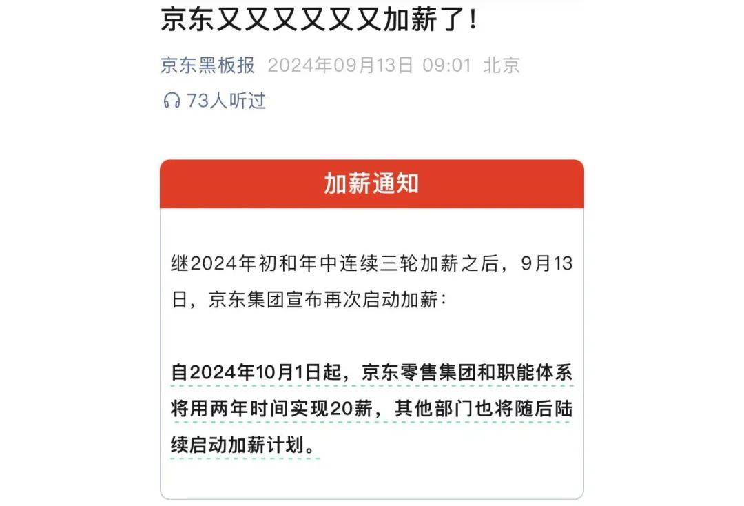 9月13日,京东集团宣布,全员涨薪,自10月1日起,京东零售和职能体系,将用两年时间实现20薪,其它部门也将陆续启动加薪计划。