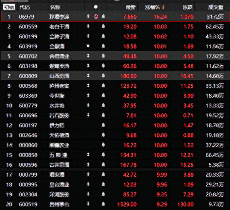 9月26日,白酒板块持续拉升走高。截至收盘,珍酒李渡涨超16%,涨幅位居板块第一,五粮液、山西汾酒、古井贡酒等15股涨停,贵州茅台涨超9%。