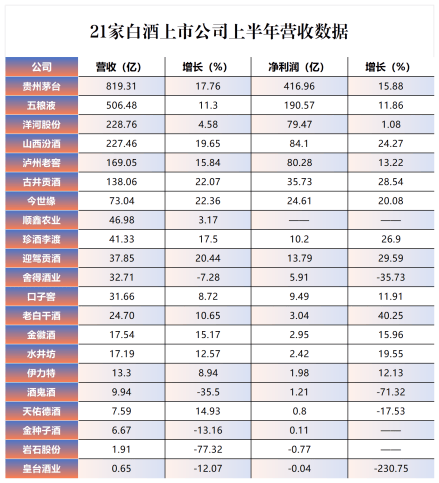21家白酒上市公司上半年营收数据